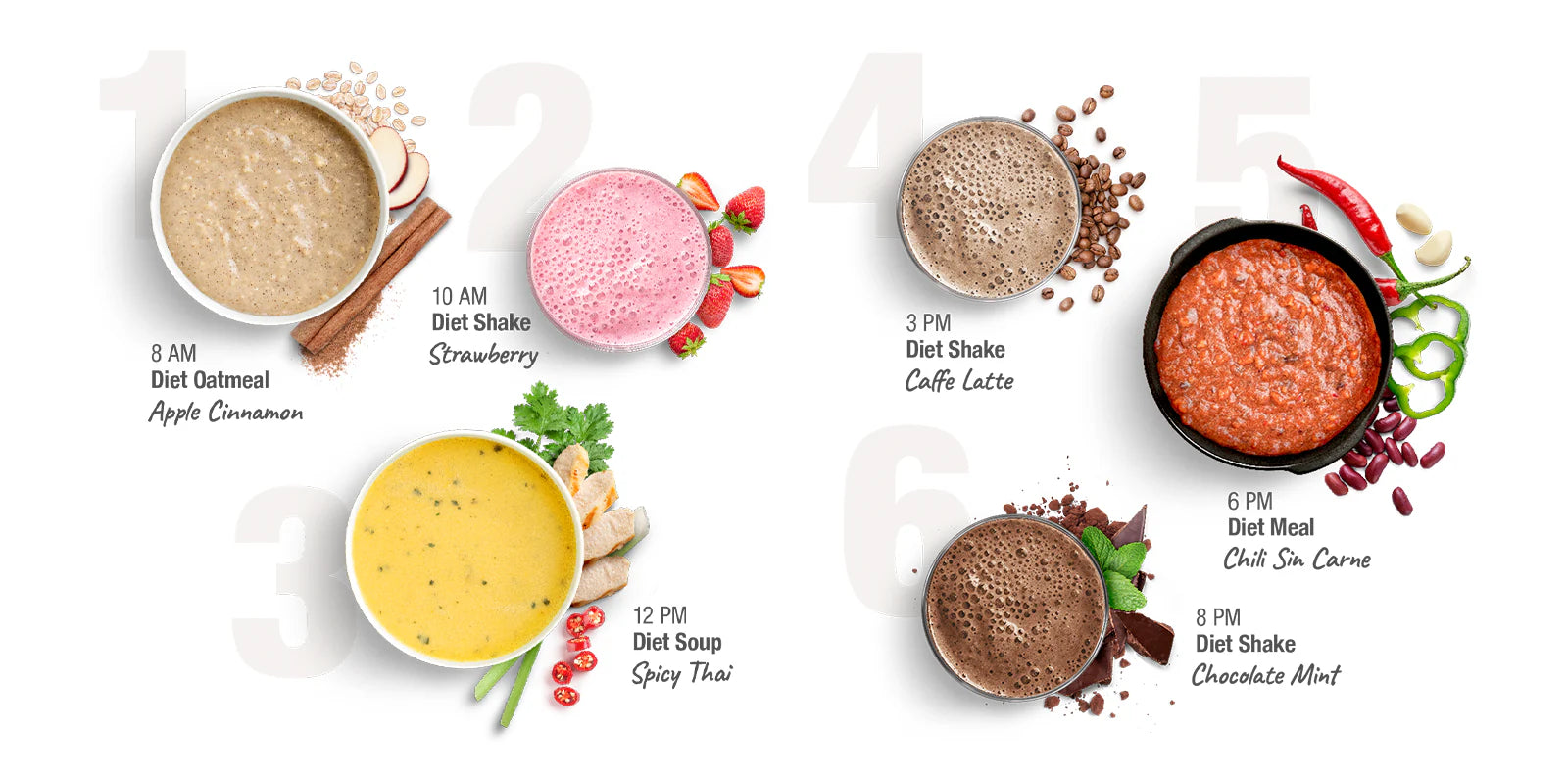 - A diet that replaces all your meals with 6 daily Diet portions (mix between shakes, soups and meals)