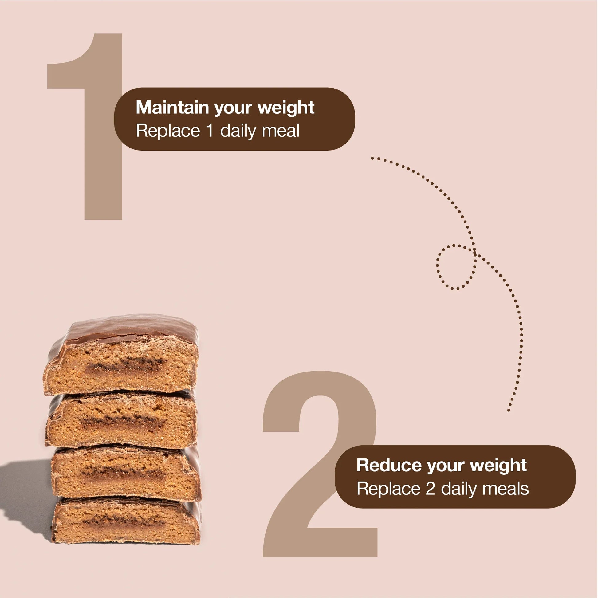 Meal replacement for weight control with chocolate flavouring and sugars-free dark chocolate flavour coating. Contains sweeteners.