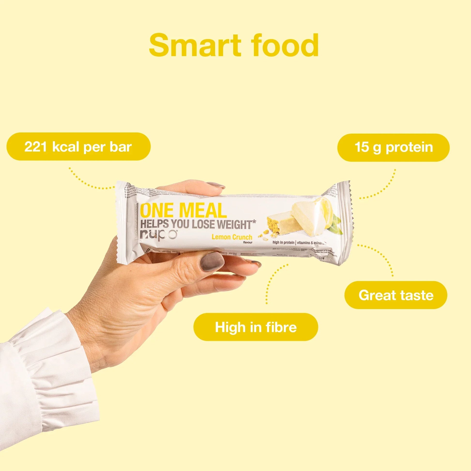 Meal replacement for weight control with lemon flavouring, soy and rice crisps and yogurt flavour coating. Contains sugars and sweeteners.
