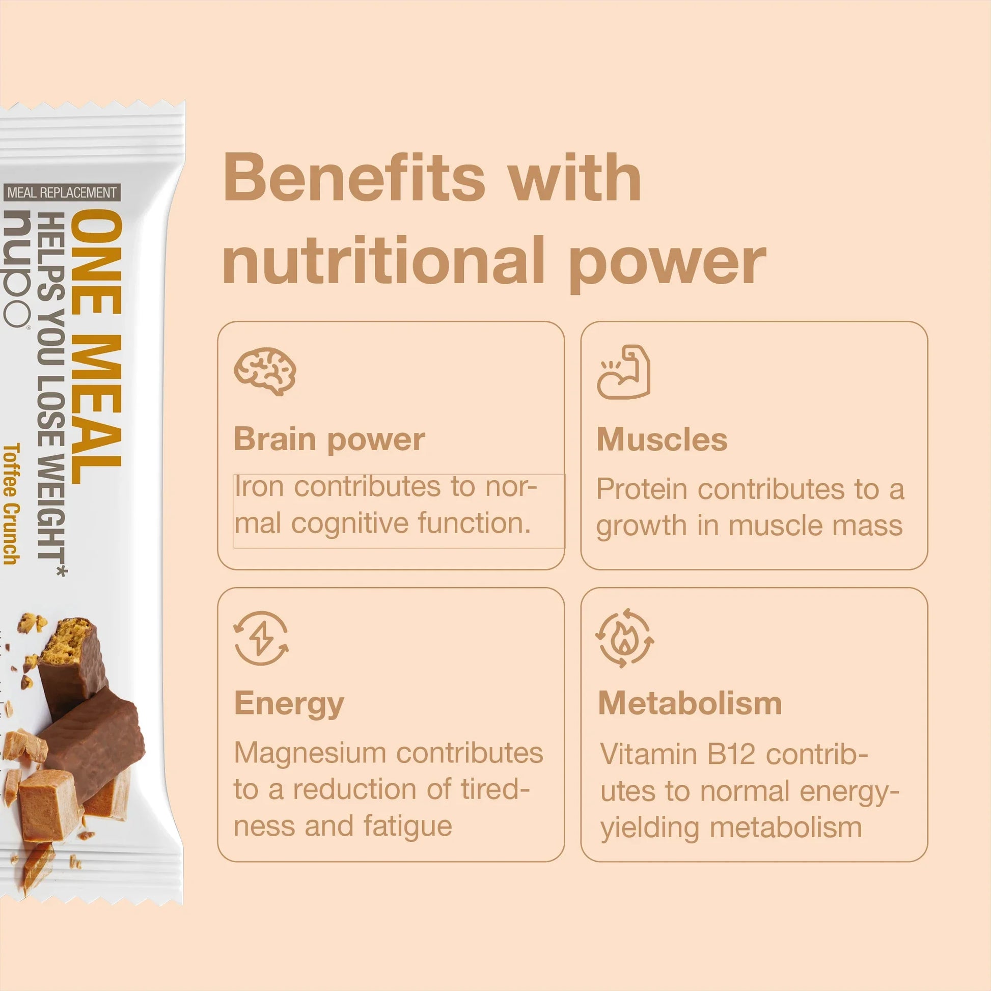 Meal replacement for weight control with toffee flavouring, soy and rice crisps and milk chocolate coating. Contains sugar and sweeteners.