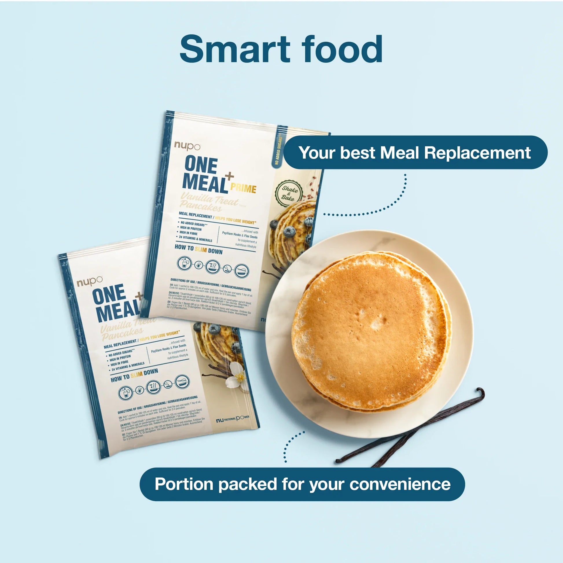 Ready-to-mix pancake powder with vanilla buttermilk flavouring. Meal replacement for weight control. Contains sweetener.
