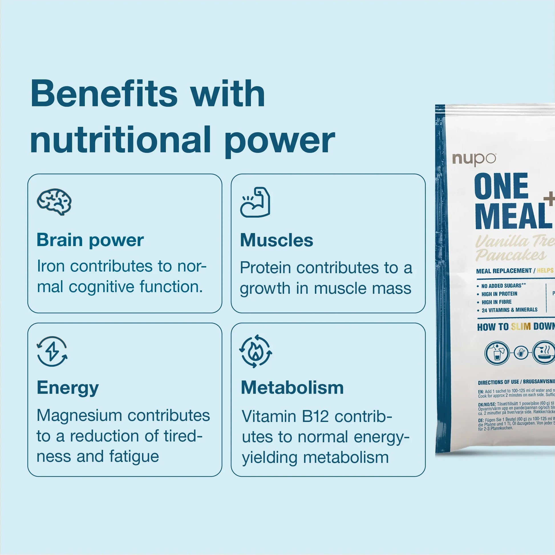 We do not recommend combining Nupo Diet and Nupo One Meal due to the difference in nutritional content, and thereby ensuring that you get all necessary nutrition when using Nupo Diet.